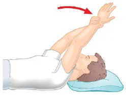1. Arm overhead, with elbows bent (flexion in lying) (shown for right shoulder)
